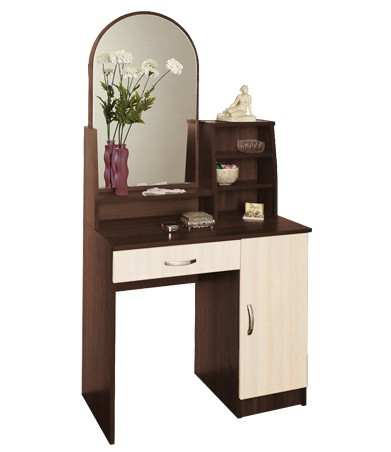 Туалетный стол «Надежда-М09» – эстетичный и функциональный предмет интерьера, создающий для пользователя необходимые условия для поддержания красивого внешнего облика. Зеркало полуовальной формы располагается справа, слева выполнена конструкция с открытыми полками для размещения флаконов с парфюмерией, сувениров, статуэток и т. п. Выдвижной ящик и секция с распашными створками позволяют хранить множество полезных вещей. Свободная ниша слева позволяет удобно располагаться человеку непосредственно перед зеркалом в положении сидя.