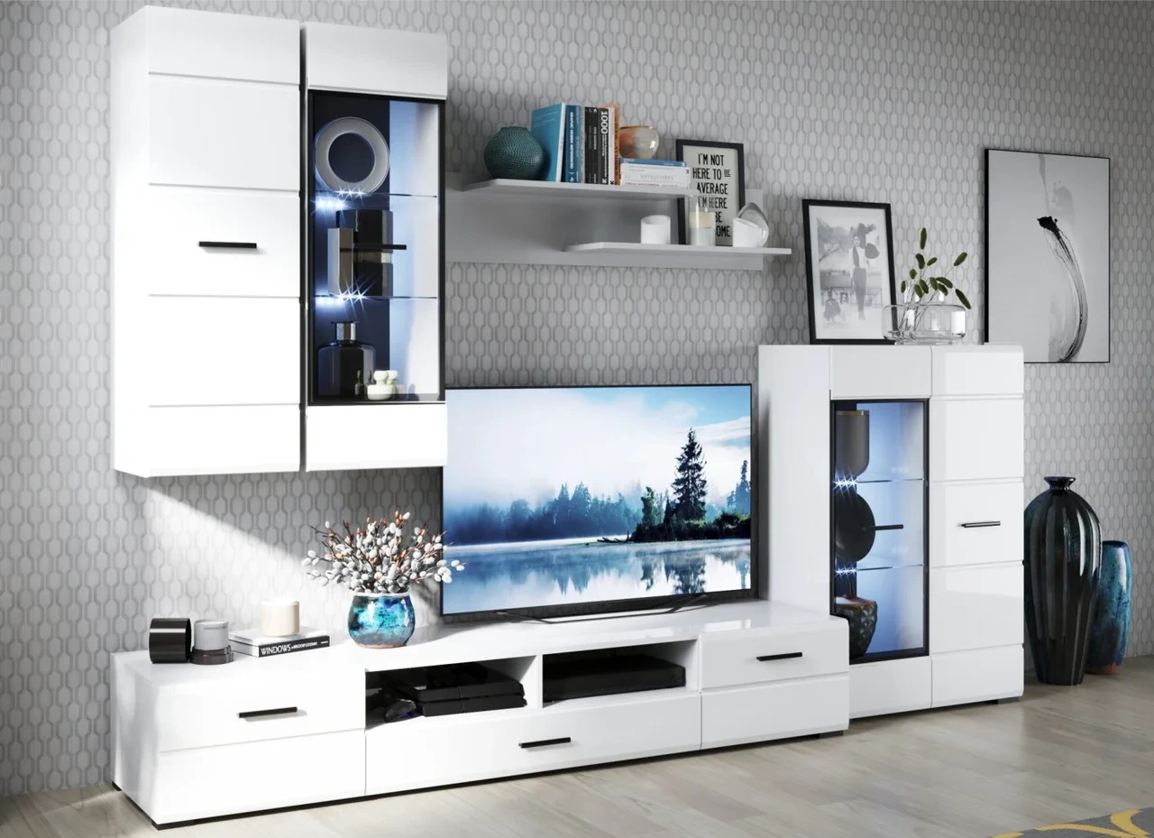 Каркас гостиной выполнен из ЛДСП, фасад - МДФ белый глянец. Ширина 2756. В указанный комплект входят: