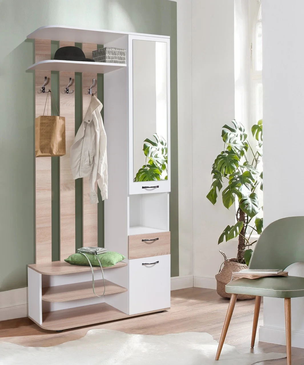 Прихожая имеет дво цветовых решения: белый/дуб сонома и бетон.